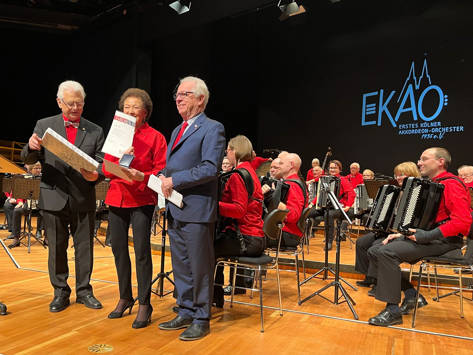 Im Rahmen der Feierlichkeiten überreichte der DHV-Vizepräsident der langjährigen Mitspielerin Annemy Pauly die Ehrenmedaille in Gold für 75 Jahre Engagement in der Akkordeonbewegung. Darüber hinaus wurde sie vom 1. Vorsitzenden Winfried Haushalter für ihre 70-jährige Mitgliedschaft im Ersten Kölner Akkordeon-Orchester 1935 e. V. besonders geehrt.