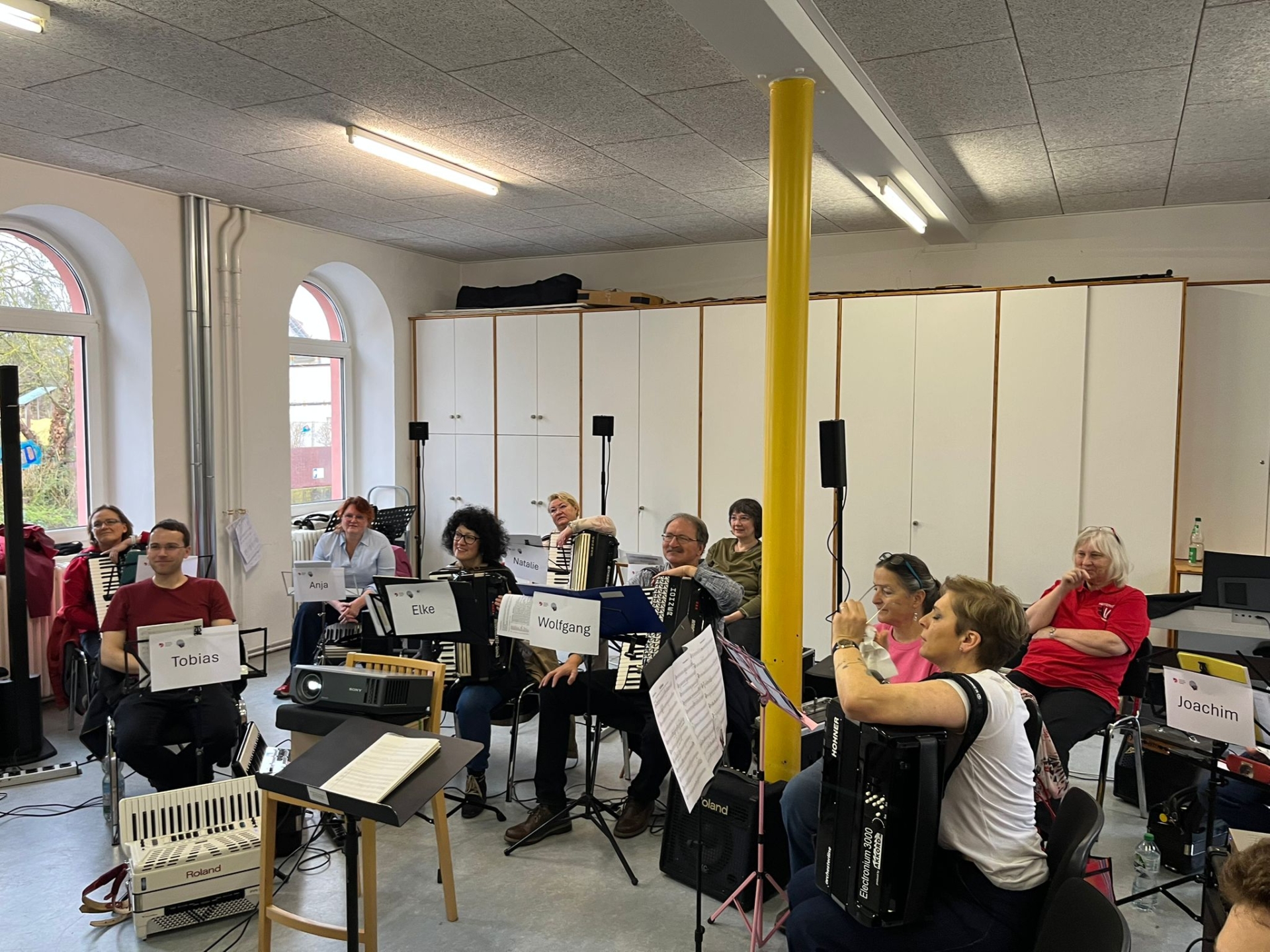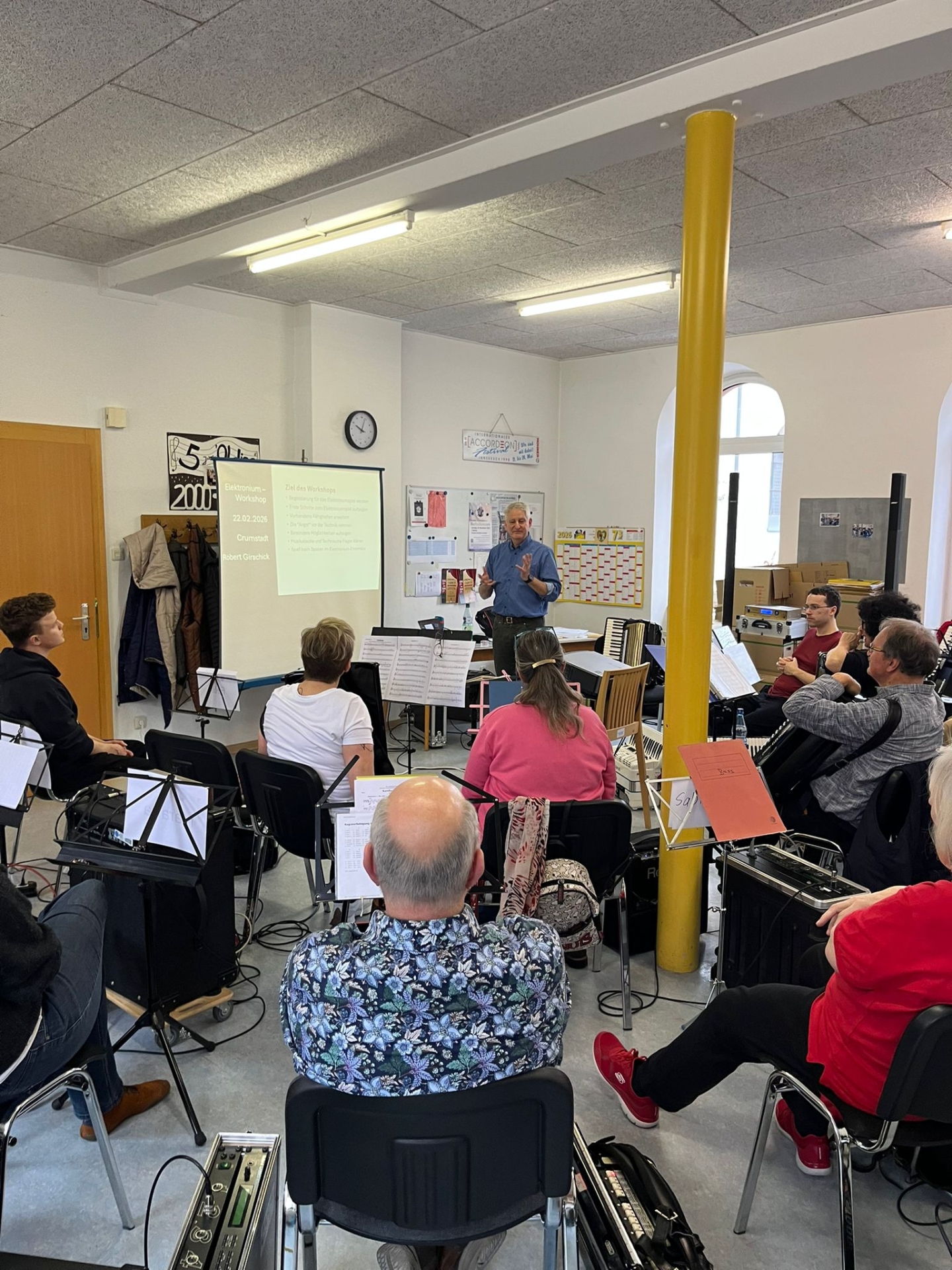 Pünktlich um 10 Uhr begrüßte Marc die Anwesenden im Proberaum der Akkordia ’73 Crumstadt e. V. (herzlichen Dank!) und startete eine kurze Vorstellung seinerseits und aller Teilnehmenden. Hier war bemerkenswert, dass sich nicht nur von alten Hasen bis hin zu Neulingen am Elektronium alle Erfahrungslevel im Raum befanden – also genau das, wozu der Workshop gedacht war. Man hatte die unterschiedlichsten Elektronien mitgebracht – alles, außer den alten Röhrengeräten, war vertreten.